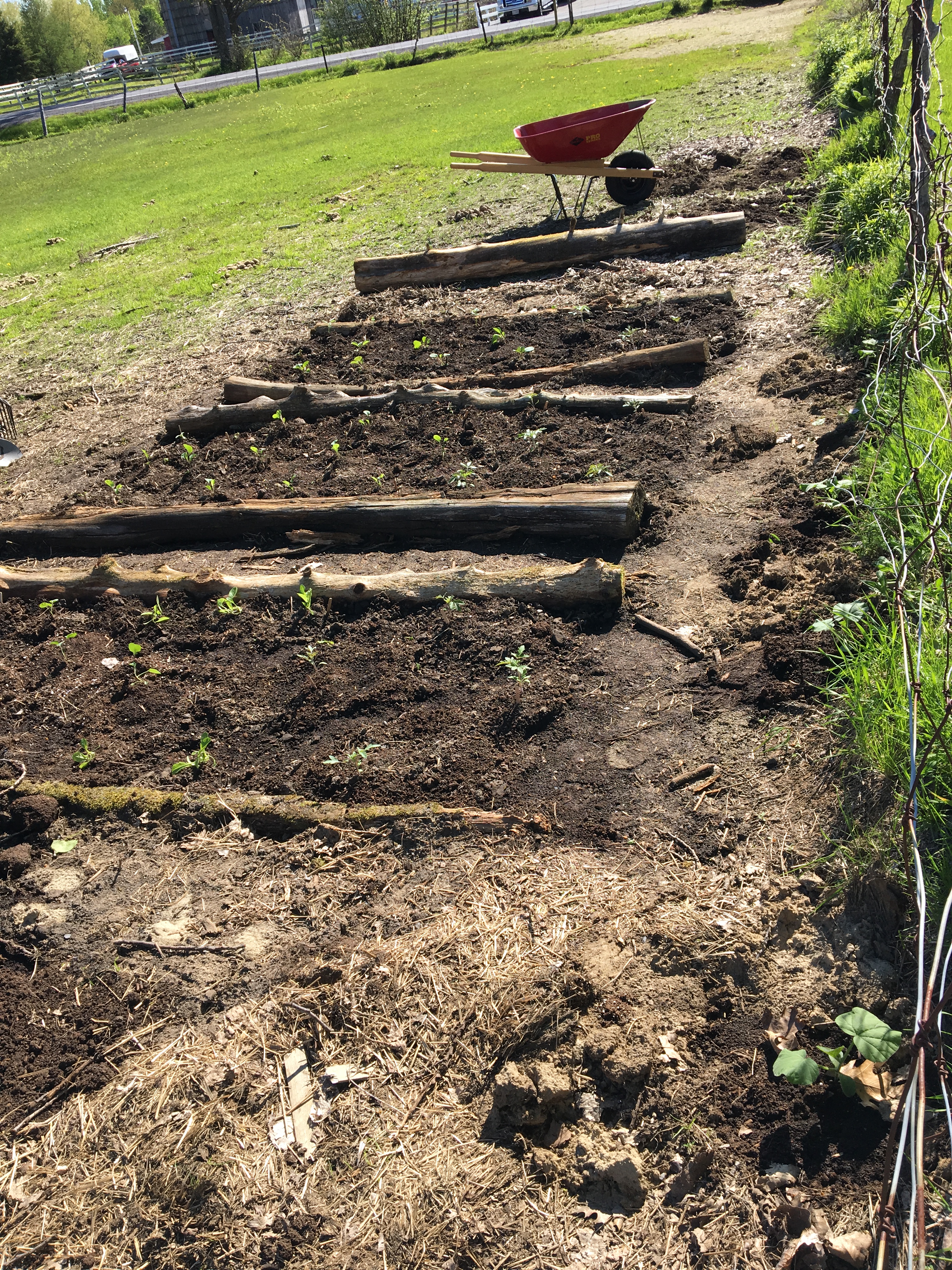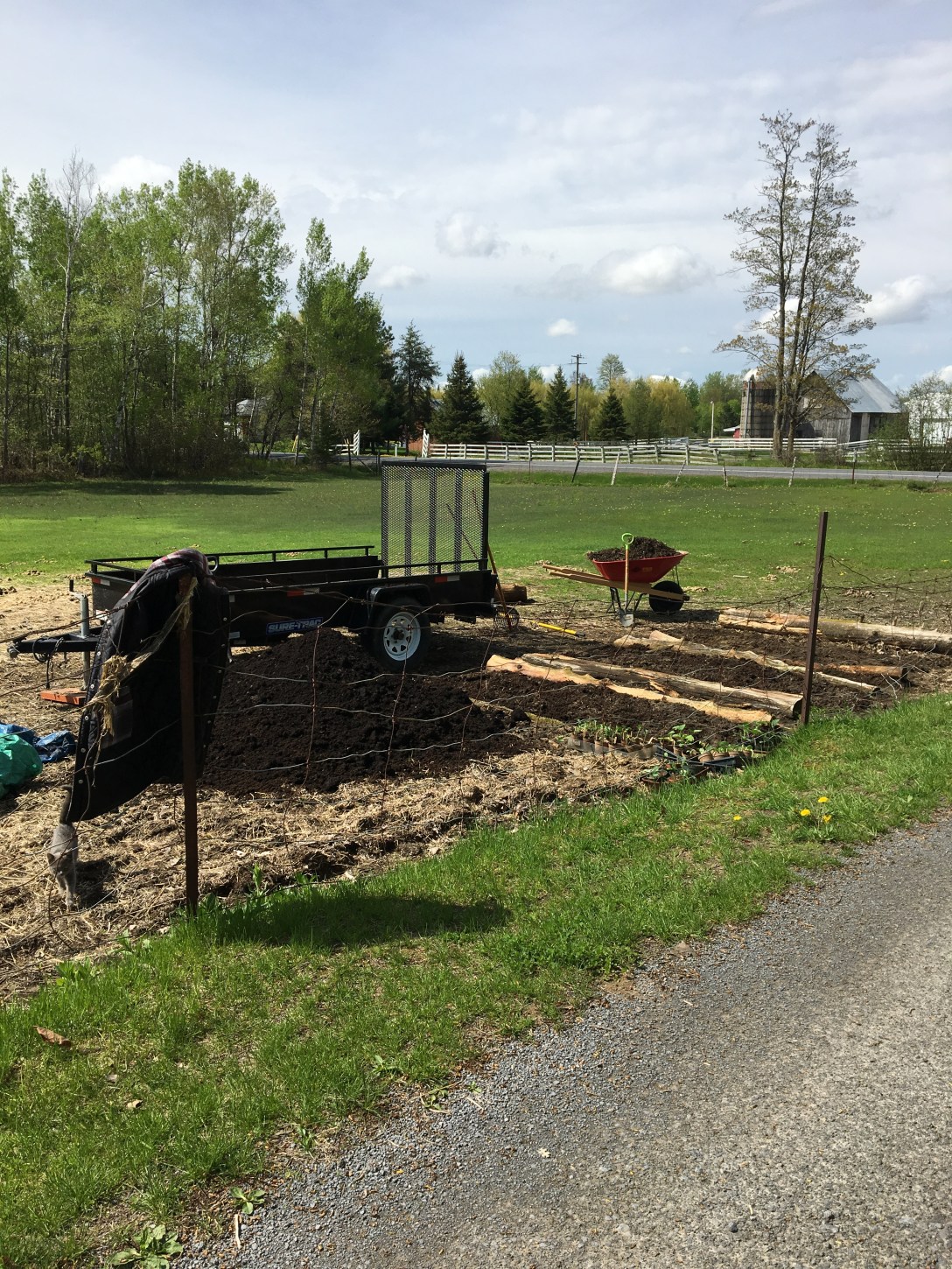 So while I was working on filling out those forms (seems easier than done!) I also managed to plant all my seedlings, save for the Swiss chard, this weekend. I had way more plants then plots so at the last minute I had to carry over a few more tree stumps, dig and prepare a 3rd bed and plant quickly before the rain. I love planting on rainy days. If you get your timing just right, you plant when the sun is not too strong to burn your delicate plants and then the rain takes care of the watering. My timing was perfect this year ! A friend brought me a yard and a half of garden earth! 30-30-30 mix. Perfect and what a treat. You know you are a homesteading girl when a load of earth makes your heart skip a beat 😉