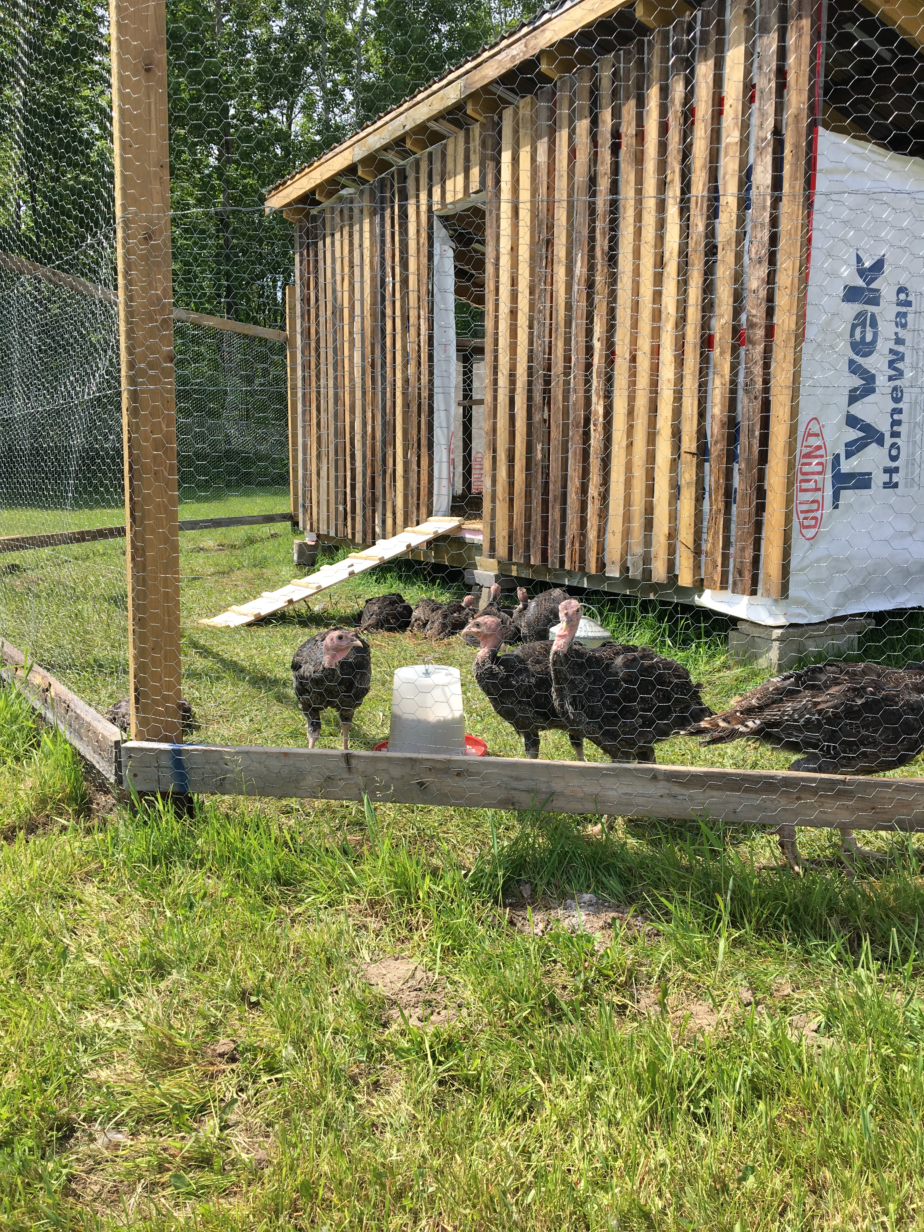 The turkeys were quickly moved to the coop. It took showing them how to go up and down the ramp a few times before they figured it out but all seems good with them. We added a perch, bedding and food. We don’t have a door to the actually coop yet, but as long as the weather stays this beautiful, they should be fine.