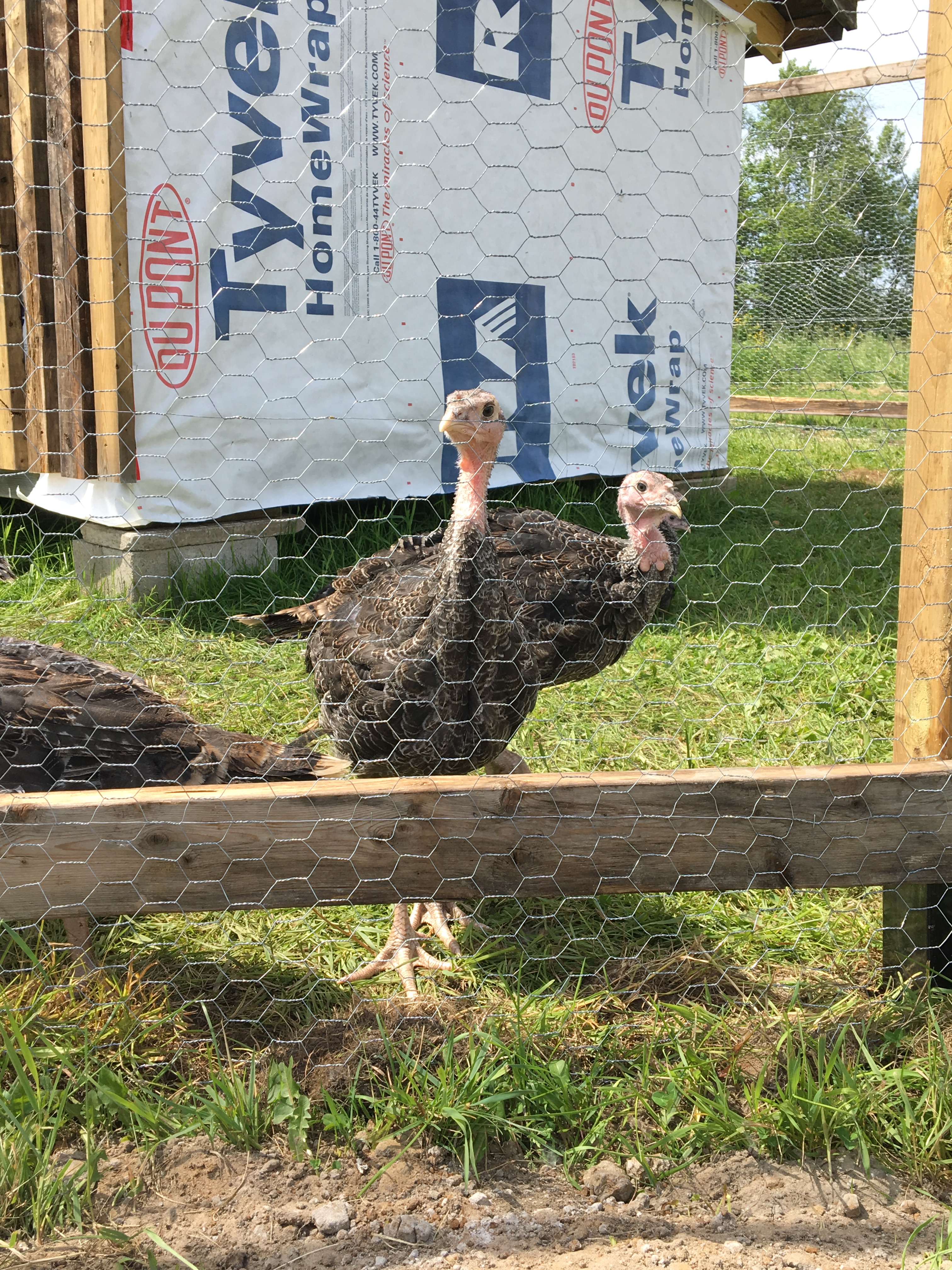 We finished fencing the coop. After some consideration, we thought the turkeys might benefit from the space more than the chickens. It was more pressing for us to get them out of the barn. The strong smell of ammonia in their pen was getting way too strong. Some turkeys even seem to have developed a slight nose bleed!