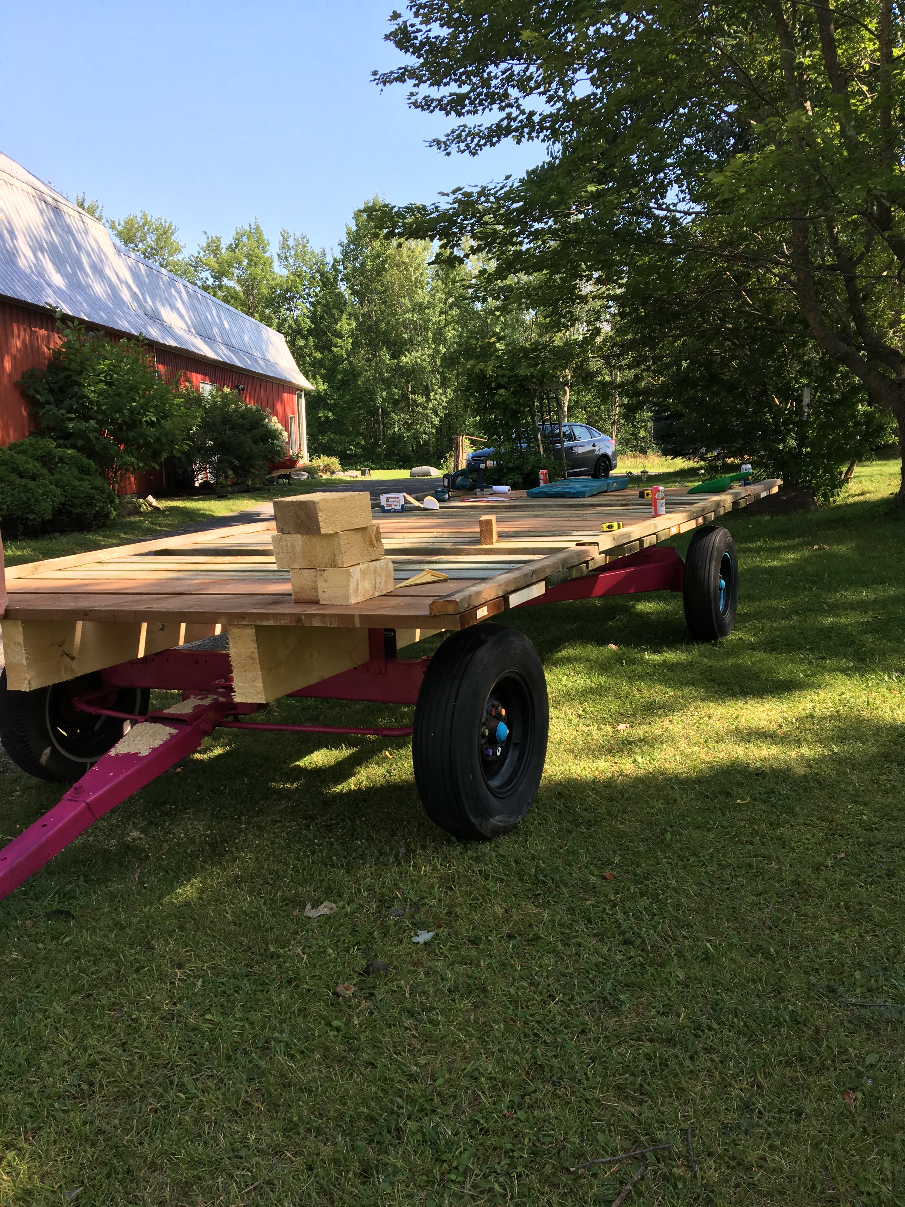 I spent time on the hay wagon with Brian. We got the frame done and added the floor boards. It’s so pretty! Quite a site with its pink frame. Now to decorate it for the fair! I plan on having one of OPUS’ Rockbands set up on the hay wagon and play some tunes during the Navan Fair parade. Should be a blast.