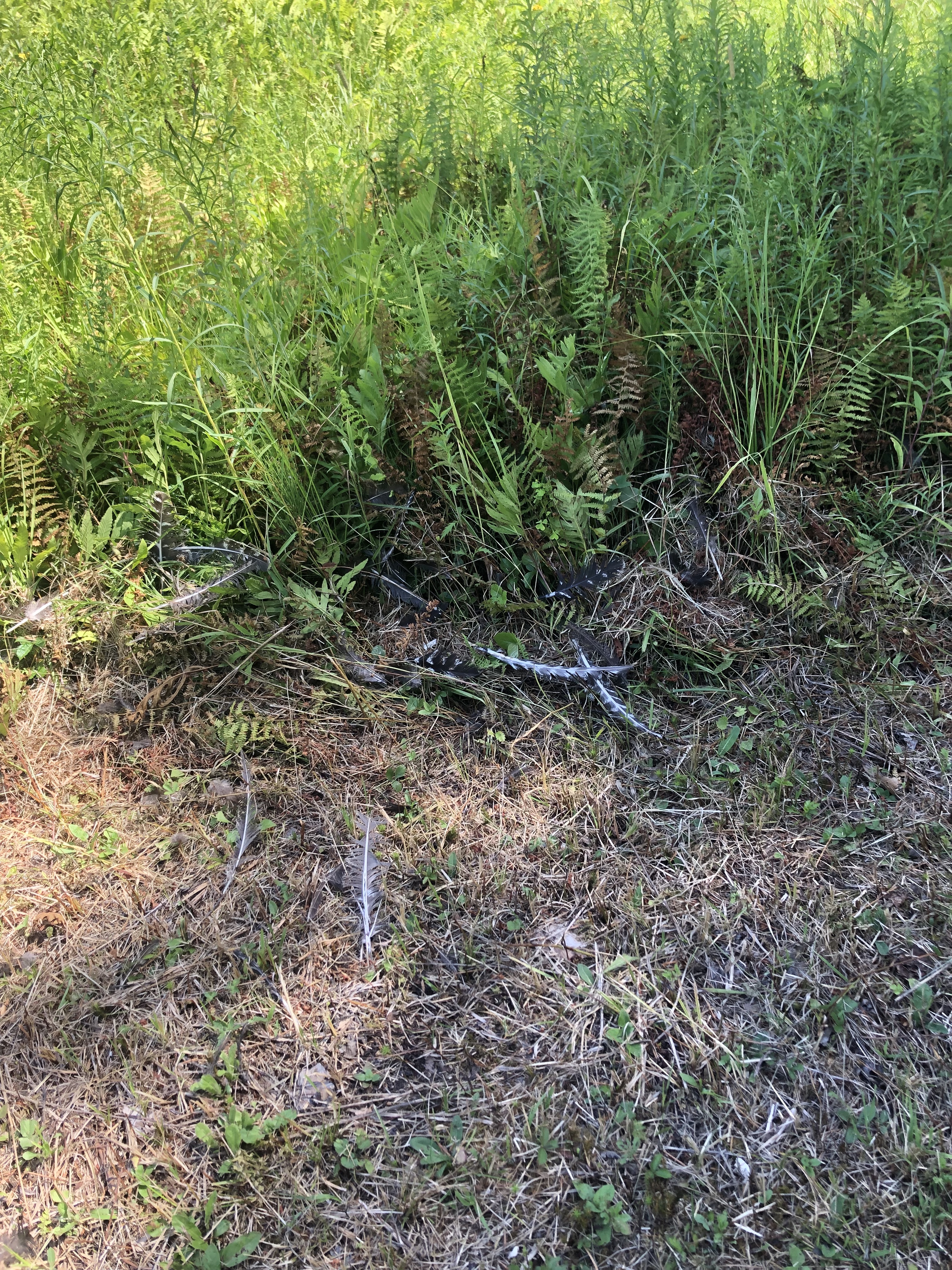 It’s a beautiful sunny day. By mid-afternoon, the heat is getting a bit too much for physical labour and so I decide to mow some of the land. In my second hour of mowing, behind the turkey coop, I see 2 patches of long feathers. Then against the section where I leave the long grasses grow, a big patch of feathers. Hmmmm.