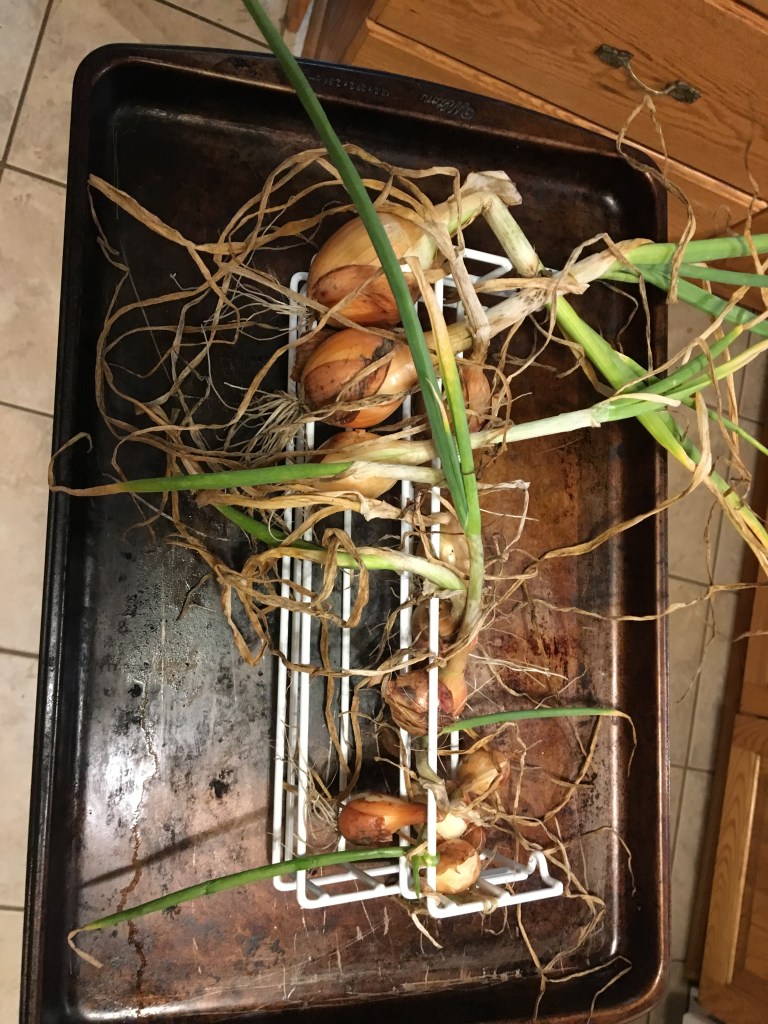 We are drying a few onions for fun. They have not all grown to their full potential but we wanted to check the process out. We are letting them dry in the open for a few weeks. This will allow the skins to dry and help preserve them through the winter.