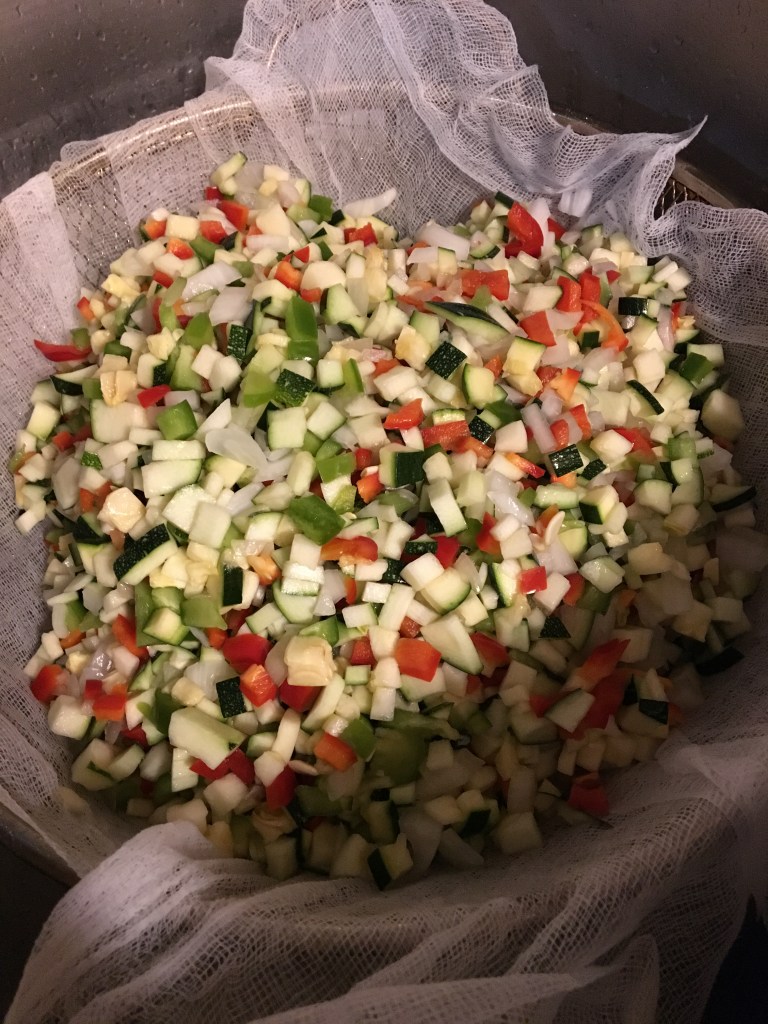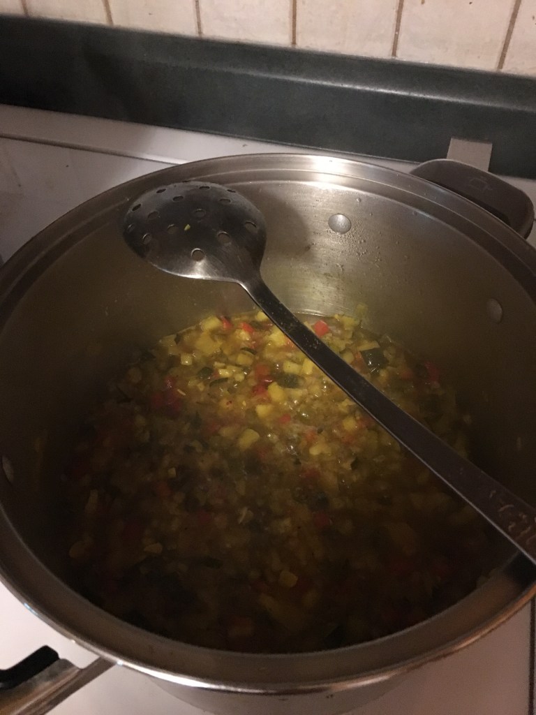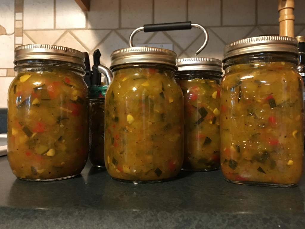 A friend grew amazing zucchini and gave me one. By the time I prepared it to make zesty zucchini relish, it gave me over 8 cups! So, now we also have a new relish to try. It should sit a few weeks before we have some.